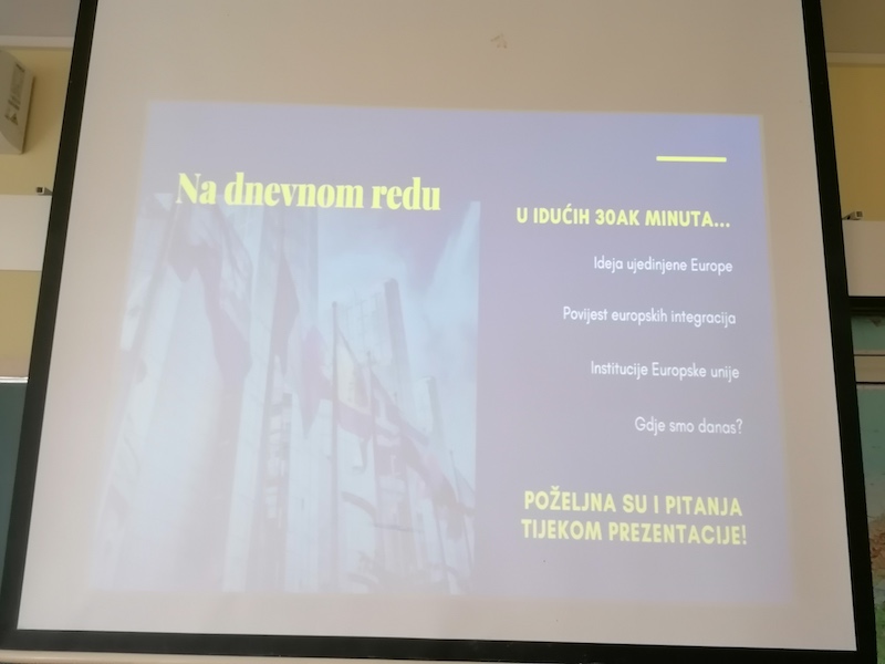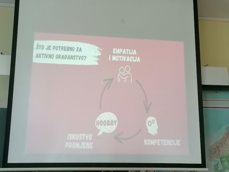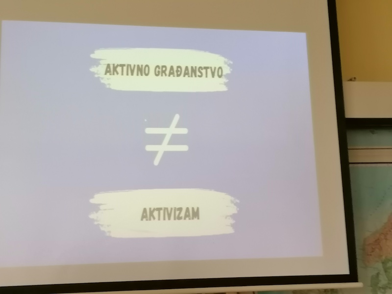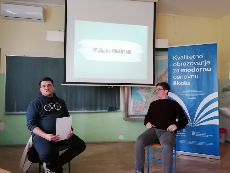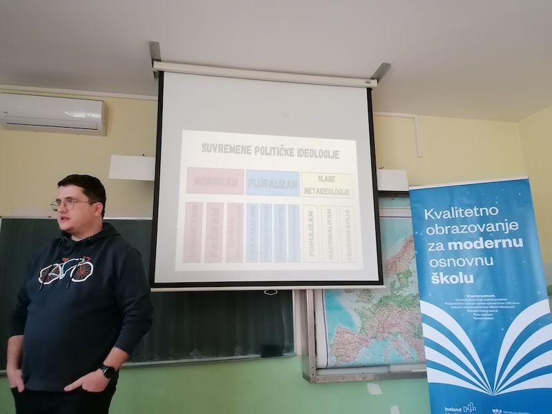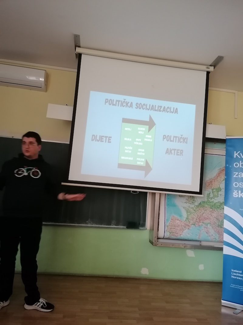 Edukaciju za učiteljice i učenike o političkoj i EU pismenosti održao je Nikica Torbica iz DKolektiva s namjerom prenošenja osnovnih znanja o političkoj pismenosti te političkim ideologijama, osvještavanju o vlastitim političkim pozicijama i kako ih stvaramo te o ulozi aktivnih građana u suvremenoj demokraciji. Sudionici i sudionice upoznati su sa politikama na EU razinama, kako se kreiraju i utječu na naše živote na lokalnoj razini. Dio edukacije je bio posvećen i intervjuu sa Sašom Milakovićem kao mladom aktivnom osobom, koja se angažirala u svojoj zajednici i prije punoljetnosti. Prisutnima su prezentirani i drugi primjeri dobre prakse aktiviranja mladih, rezultati istraživanja među mladima kao i preporuke vodećih stručnjaka o radu na povećanju političke pismenosti i aktivnog građanstva među mladima kroz Građanski odgoj i obrazovanje, Vijeće učenika te druge modele demokratizacije škole.
